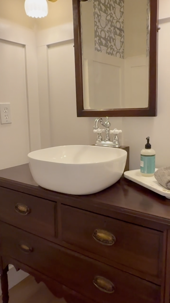 Even better, the wallpaper was custom-designed by the homeowner herself, a graphic designer. The pattern includes illustrated dogs — a deeply personal detail that transforms a small bathroom into a meaningful design moment.